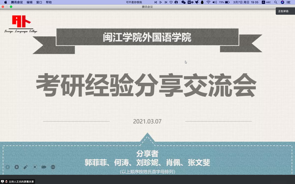 会议伊始,主持人依次介绍了进行交流分享的五位学长学姐:现就读于新疆喀什大学学科英语专业的郭菲菲、上海海事大学英语语言文学专业的何涛、暨南大学英语笔译专业的刘珍妮、武汉理工大学英语笔译专业的肖佩、华中师范大学心理健康教育专业的张文斐。会上,郭菲菲同学提到,考研初试成绩不能决定最终结果,大家要端正心态,为可能到来的线上复试新形式做好充分的准备。何涛同学提到,面对即将到来的复试挑战,大家要做好积极应试和准备调剂的两手准备,做到有备无患。刘珍妮同学根据自己的线上复试经历为大家分享了一些线上复试注意事项和方法技巧,使同学们对线上复试考试有了一个更为全面深刻的了解。肖佩同学着重为大家剖析了考研复试中的自我介绍环节,提醒大家一定要充分重视,为复试考试增加自身亮点与竞争力。最后,张文斐同学为大家推荐了一些有益于考研复试的微信公众号和参考书籍,鼓励大家一定要多读多看,认真复习。