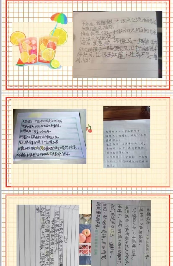 本次闭幕式的流程分别是优秀成果展示,颁奖典礼,授课老师、员工代表及双方指导老师发言。首先是优秀成果展示,本次实践活动以“十年后,你想成为什么样的父母”为题,鼓励同学们积极创作成果如图.
