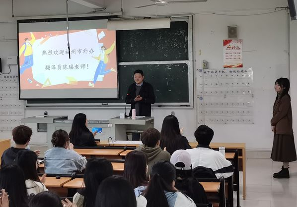 为了使员工掌握的知识和习得的技能能真正满足职业岗位的实际需要,解决理论脱离实际的问题,口译教学团队策划“一线口译员进校园”系列活动,以岗位能力培养作为培养目标,突出英语口译课程的职业定向性,强化课程教学的真实性,进一步助力应用型翻译人才培养。口译教学团队邀请福州市外办翻译员陈瑶及宋晗阳女士参与《英语口译2》的课堂教学,并在第二课堂开设面向全院的讲座《浅谈外事礼宾礼仪与地方外事活动译员角色的动态性》。