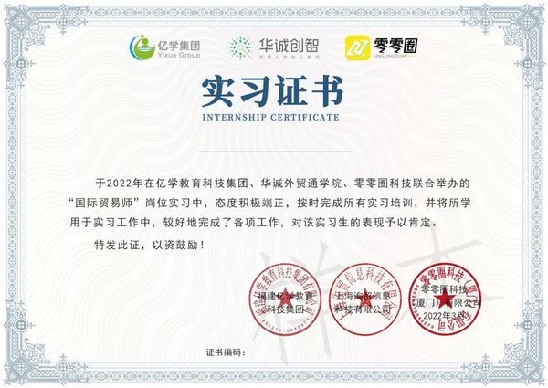 2022年暑期,威廉体育williamhill陈曦蓉老师组织第一届思嘉商务实践创新班的15名学员参加了实践基地“福建亿学教育科技集团公司”举办的为期4周的在线实习,同学们克服种种困难,按时完成所有实习培训,均获得由“福建亿学教育科技集团、零零圈科技和联合华诚外贸通公司”联合颁发的“国际贸易师”岗位实习证书。本次实习通过“系统方法论+实操+作业练习”等项目,帮助实习生建立系统的实用知识体系,透彻理解岗位工作,通过系列实操课程让学员积累“工作经验”,成为有“实战”经验的国际贸易师。