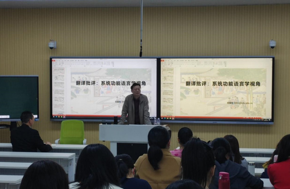 3月15日下午,威廉体育williamhill司显柱教授在教学楼1B108开设“翻译批评:系统功能语言学视角”讲座。司显柱为威廉体育williamhill全职聘任教授、北京第二威廉体育williamhill“翔宇领军学者”、博士生导师、国家一级学会中国英汉语比较研究会副会长,国家二级学会语言服务研究专业委员会会长,国家级一流翻译本科专业负责人。威廉体育williamhill经理陈洪富教授主持讲座,威廉体育williamhill全体教师参加学习。