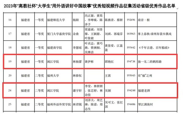 近日,由全国高等公司大学外语教学研究会指导,南京大学主办,高等教育出版社协办的第二届“高教社杯”老员工“用外语讲好中国故事”优秀短视频作品征集活动评选结果发布。公司由邱艳红老师指导,林杨蕾、苗伊彬同学制作的作品《独一无二的鹤形路》荣获福建省一等奖,吴颖老师指导,潘宇轩、李莹、林妍妍、张芯婷、林诗佳同学制作的作品《福建老酒》荣获省二等奖。