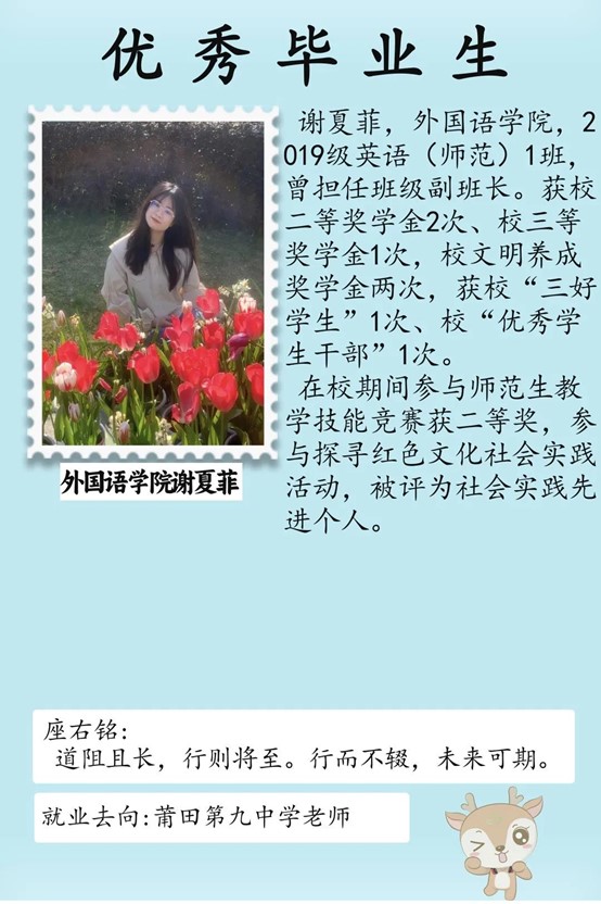 六十五载栉风沐雨,六十五载弦歌不辍。2023年,威廉体育williamhill迎来了六十五周年华诞。为传承母校优良美德,发扬员工优秀之光,在校庆到来之际,闽院小外推出优秀毕业生舍谱展系列推文,接下来就跟随小外一起来看看优秀的学长学姐们吧!