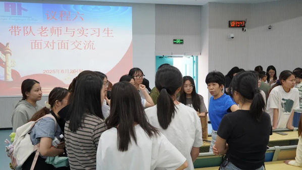 接着,郑海锋老师结合实习经验,给出指导性建议:一是筑牢安全防线,严守安全底线,做好个人防护;二是提前了解实习公司环境与教学特色,加强与指导老师的沟通协作;三是坚持知行合一,认真完成教学及班级管理任务,主动参与教研活动,虚心求教,坚定教育理想信念;四是坚定理想目标,彰显青春风采,在做好教育实习工作的同时,积极展现外院学子的良好精神风貌。