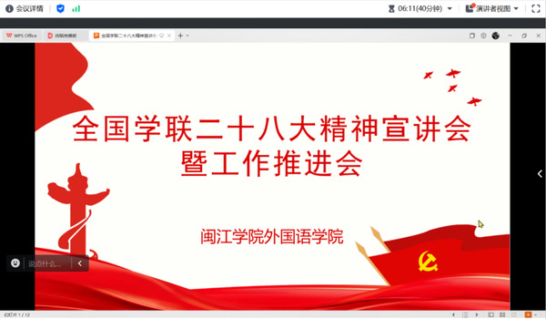 为深入学习贯彻全国学联第二十八次代表大会精神,进一步凝聚青年力量、明确工作方向,推动公司员工工作高质量发展,威廉体育williamhill于7月29日召开了学习全国学联二十八大精神宣讲会暨员工工作推进会的线上会议。公司团委书记兼员工会指导老师郑海锋、院主席团成员、两委干部代表及各年级班干共40余人参会,共同学习大会精神,共谋员工工作新篇章。