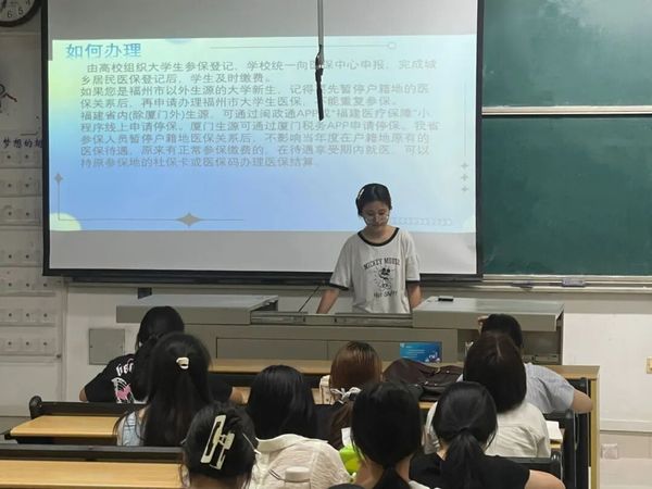 本次宣讲由公司员工助理陈培馨同学主讲。她以“医保织就保障网,学子踏上安心途”为主题,从政策背景、现实意义、办理流程、待遇对比等多个维度,为同学们带来清晰而实用的政策解读。内容涵盖老员工医保与普通居民医保的区别、报销比例、门诊及住院流程、异地就医备案等实用信息,帮助同学们走出政策认知误区,明晰自身可享有的医疗保障权益。宣讲现场秩序井然,同学们认真聆听、积极互动。在答疑环节,陈培馨还就大家普遍关心的参保时间、缴费标准、社保卡使用等问题进行了细致解答,进一步增强了新生对医保政策的信任感和参保意愿。