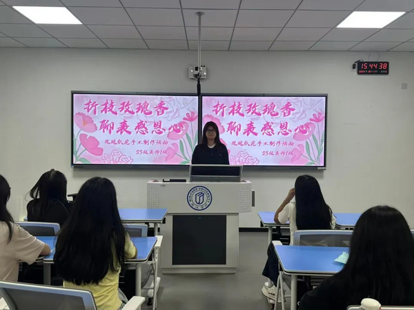 制作环节结束后,支部成员们分组行动,将亲手制作的玫瑰纸花,赠予平日里辛勤付出的老师、默默奉献的食堂工作人员以及时刻守护校园安全的保安人员。每一朵独一无二的纸玫瑰,都承载着同学们最真挚的谢意。这一送一收的互动间,不仅是物质的馈赠,更是精神的交流与情感的共鸣,让感恩教育从课堂理论走向了鲜活的生活实践,深化了同学们对劳动与奉献的理解。